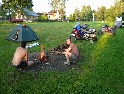 Ráno po snídani a výborné ranní koupeli balíme, sedáme do sedel a jedeme po „čáře“ směr Hora sv. Kateřiny, Kalek, Hora sv. Šebestiána, odtud cyklostezkou na hlavní silnici co vede do Černého potoka, kde odbočujeme na Kovářskou. Z Kovářské pokračujeme směr Klínovec, kde ostatně vymejšlím zase „zaječinu“, jakož i předloni, a jednoduše odbočuji pod sjezdovkami přímo na ně. Kluci offík přivítali a tak si dělám srandu, jestli si dáme jedničku, dvojku a nebo černou sjezdovku. Sázíme za jedna a vzhůru sjezdovkou až k vysílači, kde z nás nechápali jacísi turisti a hned si nás fotili. V Božím Daru po dotankování mazlíků se vydáváme cestičkou na Potůčky, Horní Blatná, Nové Hamry, Jelení a Stříbrná. Tyhle poslední úseky od Hory sv. Kateřiny až sem se vyplatí si projet. A i když jsem tudy jel už potřetí, zase se mi tu líbilo. Libovolně přejíždíme jižněji k Mariánským Lázním za městečko Klášter do pěkného malého kempíku. Cesta sem nebyla špatná až na jednu opět zajímavou offíkovou vsuvku. Jedeme si takhle zákazem vjezdu, kde byla silnice v rekonstrukci, až dojedeme k mostu, kterej tam holt nebyl. Po domluvě skáču na Varana a brodím. V brodu nebylo zas tolik vody, nebojte se, ale zato o co míň vody tam bylo, tak o to tam byly větší šutráky a prudší protější svah. Co myslíte, povedlo se??? áááále povedlo, sice jsem měl asi třikrát návrh od Varana, že by si ustlal, ale rozmluvil jsem mu to a vyjeli jsme to. Po mne hnedle brodí Martík a taky se mu vede, i když s těmi samými návrhy od Kačeny na ustlání si. A copak ten Křeny s tou jeho bavoráckou adventurou? Hned nás poslal k šípku a po vedlejší uzoučké lávce dvakrát lomené přejíždí na druhou stranu. Nicméně po přijetí do kempu shazujeme bagáž a jelikož jsme si koupili špekáčky, vydáváme se s Martíkem do lesa pro dřevo. Motorky jsme nabalili klestím a po příjezdu do kempu na nás koukali lidi, jako kdyby přijeli dvě rumunský bryčky s klestím. Po přípravě na oheň probíhá očistec v rybníčku a následně špekáčky proložené dvěma pivy v kiosku a za stálého hraní harmoniky a zpěvu ruských písní od vedlejšího stanu siestíme pod hvězdami. Kdekoliv v kempech hrajou kytary, ale u Mariánek jedou Kalinku a harmoniku. Je ale pravda, že jsem takhle instrumentálně Kalinku ještě neslyšel. Ráno po snídani vlastního ražení sedáme do sedel a přes Domažlicko a Klatovsko míříme do Českých Budějovic, kde se po krásném prodlouženém víkendu loučíme a rozjíždíme k domovům.