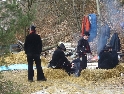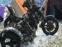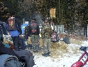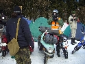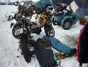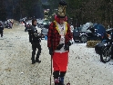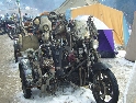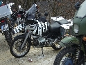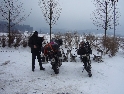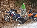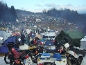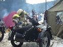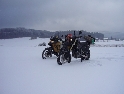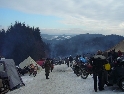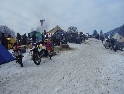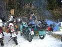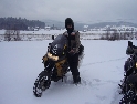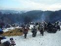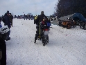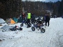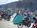 Jako se vždycky o něčem mluví u piva v hospůdce, tak se dostalo i na letošní Elefantentreffen a nemuselo se to ani nijak velice probírat. Když jsem řekl, že už třetí rok o srazu mluvím a ještě jsem se tam nedostal, pronesl jsem, že bych letos prostě jel. Jako jediný se okamžitě přidal Kamil (DRZ 400SM) a bez jakéhokoliv komentáře prohlásil, že zkrátka jede, což se nedalo říci o ostatních. No tedy dobrá, ale než se dostalo vůbec na vlastní odjezd, musela proběhnout údržba a přezutí na drapáky na Kamilově motardu, nákup potravin, rumu a hlavně vína, ze kterého manželka udělala doma vynikající svařáček doplněný řízky a karbanátky. Jídlo máme, pitivo taktéž, stroječky v „lati“, tak nezbývá než vyrazit na „zkušenou“ do Bavorského lesa. Odjíždíme z benzinové pumpy ze Zlivi třicet minut po poledni, nemáme na spěch, protože to máme necelých stodvacet kilometrů. Tím se není ale třeba chlubit, protože je „kvantum“ motorkářů, kteří to mají jak dál, tak i zatraceně dál. Jedeme, nebo jak by řekl Kamil, „sypeme“ přes Prachatice směr hr. přechod Strážné se zastávkou ve Volarech na doplnění teplých tekutin a u Kamila ještě jedné mikiny. Cestou sem ale potkáváme dva kluky na babetách, kteří mají jakýsi defekt. Stavím a ptám se, jestli nepotřebují pomoct. Kluci „zmrzle“ odpovídají, že jim prasknul zadní plášť, ale že to je v pohodě a izolačkou omotávajíc zadní prasklou gumu pronáší - „Kluci v poho sejdeme se tam.“. Celou dobu jedeme po rozsolené silnici, jen před Lenorou se v lese setkáváme s ledovými zmrazky. Při příjezdu na hlavní tah na Strážné už potkáváme motorkáře a né právě malý počet. Vyjedeme z křižovatky a Kamil mě asi tak kilometr pronásleduje po zadním kole. Byla mu zima, tak potřeboval trochu adrenalinu, no. Těsně před hranicemi zastavujeme na čerpací stanici, aby Kamil dotankoval a hnedle se seznamujeme s klukama, co „valí“ z Prahy na skůtrech, a zjišťujeme, že několik z nich jede už podesáté. V tom ale přijíždí další parta na malých dirtech, jedné Gorile za doprovodu Transalpa. Hlásí se ke mně jeden z nich, je to Matěj, kterého už znám z cestovatelského webu motoreport.cz a posléze zjišťuji, že jeho kolegou je šéfredaktor z motorkari.cz Filip. Chvilku klábosíme a zjišťujeme, že kluci taky jedou poprvé, tak že se budeme doplňovat. Za jízdy držíme tempo s dirty a docela to jde, protože dirt „valí“ přes osmdesát. Nejvíce co mě ale pobavilo, byla né tak velká GPS na řidítkách už vůbec né velkého dirta Matěje, kterou posléze zaměnil za kameru a natáčel příjezd k bráně elefantího srazu. Kupujeme vstupenky a vjíždíme do areálu srazu. Je to tu hlava na hlavě a kluci mě s Kamilem vedou do levé půlky areálu, kde je roztátý svah a ani špetka sněhu. Povyjíždíme výš, kde je už jakási ledovka na cestičce a kluci nachází místo. Nejni ale pro nás všechny, tak se domlouváme, že to projdeme pěšky. Souhlasím, ale abych nevadil v kopci na cestě jiným bikerům, musím popojet ještě výš. Nu co myslíte, ustlal jsem si na ledu. Jooooo ale ani ne tak ustlal, jako vystoupil z Varana a tím pobavil pár lidiček. Hnedle ale u mne byli nějací němečtí chalani a Varana postavili zpět na kolečka. Vzdávám hluboký dík, nasedám a vyjíždím nahoru, kde parkuji a mažu se s Kamilem porozhlédnout po plácku na stan. Nenacházíme nic a tak se s Matějem a Filipem domlouváme, že se pokusíme dojet na druhou stranu kempu, která je zasněžená a je tam očividně méně stanů. Matěj na dirtu jede první, za ním Kamil na motardu a za nima já s trolejbusem na drapácích. Přijíždíme na druhý svah a při sjezdu dolů po zledovatělém uježděném sněhovém povrchu si jen tak počítám, za kolik měsíců bude jaro, abych věděl, kdy odtud s Varaderem vyjedu. „Zbruslení“ dolů se povedlo, parkujeme a Matěj se vrací pro zbytek jejich výpravy. Nic s Kamilem nehrotíme, sundáme moje i jeho věci z Varana, páč zrovna taky slouží jako Praga V3S , hnípneme na „bágly“ na zem a zvolna se snažíme zorientovat v téhle atmosféře. Kluci mezitím dovalili, začali rozbalovat stany v tom velkém svahu a chystat se na procházku kempem. My jsme zatím vytáhli svařák, začali ho ohřívat a procházku si nechali na pozdnější hodinu. Mezitím, co jsme si hověli, se setmělo a začalo to tu vypadat jako na frontě za druhé světové. Proč? Protože v pětivteřinových intervalech lítaly rachejtle, dělobuchy, vojenské světlice s padáčky, které přistávaly mezi stany, a to vše doplňované houkáním z požární sirény. Čím se ale přibližovala půlnoc a se stupňujícíma se promilema v krvi cizinců se „bordel“ zvětšoval až k tomu, že po sobě rachejtle stříleli, takže tady musel bejt jeden neustále ve střehu. Po návratu kluků z procházky, kteří „dovalili“ dřevo s pozlacenou kůrou (5 Eur balíček), začínáme rozdělávat oheň. Po úspěšném zápálení se opékají klobásy, já vytahuji karbanátky a řízky, popíjíme svařáček a hlavně koluje slivovice a whiska v placaticích. Při úbytku dřeva usuzujeme s Kamilem, že by jsme měli taky jít koupit balík a tak vyrážíme. „Vyplázneme“ 5 éček a ve dvou balík neseme, když v tom Kamilovi podjely „pastelky“. Ale neupadl a ustál to. Směju se a říkám mu - „Kam jdeš vole?“, nu a hnedle jak jsem to řekl, podjely hnáty mě a hodil jsem exluzivní záda. Kamil samozřejmě mrtvej smíchy (škodolibec jeden, co?). :-)) Potom, co jsme donesli dřevo, jdeme „občíhnout“ celý areál. Všude je spousta kouře z nepočitatelného množství ohňů a rachotu z pyrotechniky. Potkáváme pár Čechů, kteří nám ihned nabízejí domácí slívku na zahřátí a i jedno 