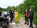 Swat: Pro změnu zase chčije !!! Naše skupina vyráží směr Bar-Kotor. Jadranská magistrála je zasekaná skoro ve všech městech. Předjíždíme auta přes plný čáry, jinak to nejde. Tankujeme benzín a jedeme do hor nad město Kotor a směřujeme směr hraniční přechod Gradine. Než se vyšplháme na kopce je 12 hodin a dáváme si oběd ve výšce 930 m.n.m. v krásné zatáčce. Chleba a konzervu. Pokračujeme dál z kopce dolů, kde už vidíme hraniční přechod. Vše jde hladce, za 15 minut jsme v Bosně. Podle plánu vyrážíme směr Trebinje a pak se dáváme na sever kolem jezera Bilečko. Opět leje jako z konve, tak si dáváme v jezerní restauraci kávu a čaj. Po půl hodině už tolik neprší, tak vyrážíme směr Plana na náhorní plošinu Dabarsko Polje. Všude kolem jsou rozstřílený a vypálený domy, projíždíme dokonce minovým polem. Chtěli jsme si zkrátit cestu v Berkoviči do Konjiče, ale místní policista říkal, že cesta je ve špatném stavu a je jen šotolinová a v dešti špatně průjezdná. Rozhodujeme se, že pojedeme přes Mostar a kaňonem kolem řeky Něretva do města Jablanica a dále k Jablaničko jezero, kde už na nás čeká první skupina. Cesta kolem řeky je nádherná, jen kdyby furt nechcalo…….. Přijíždíme v 19 hodin a ubytování už máme zajištěný. Pěkný pension u jezera, co víc si přát. První skupina si dnes užila opět offroadovou vložku. Tiše závidím. Nechápu jak to všechno stihnou a ještě přijedou vždycky první. Najíme se a padáme mrtví do postele.