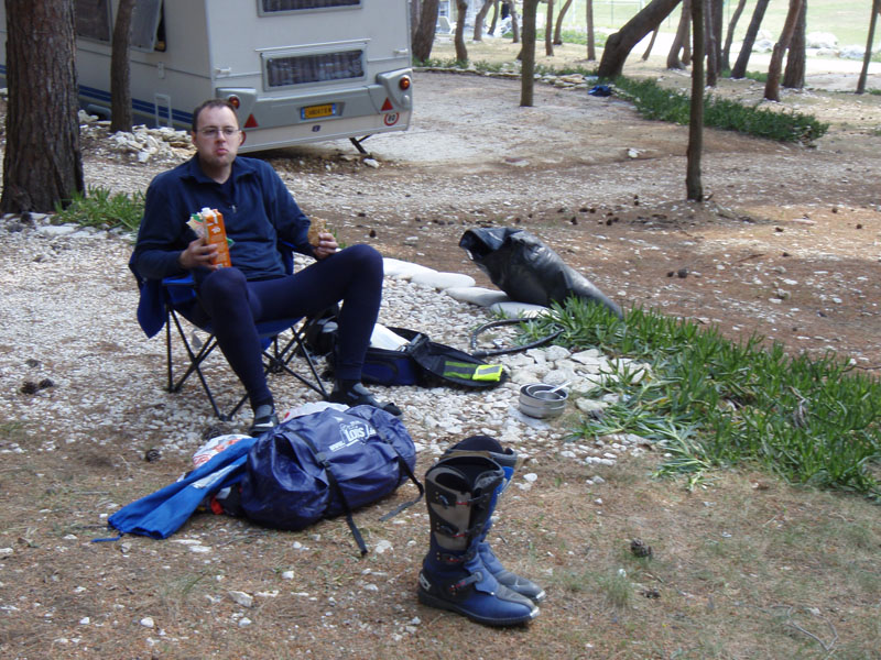 Druhý den ráno jsme po dobré snídani vyrazili na projížďku Slovinskem. Navštívili jsme Bohinjské jezero, moc pěkné a pak taky Triglavski národní park. Zbytek dne jsme trávili v Alpách a ježdění bylo více než luxusní. Připadal jsem si jak na nějaké Helmut štráse, samá modrá vrtule a Varadero ani jedno. Sem tam pár V-smrků, jinak samé bavorsko. Nutno také podotknout, že jsme si zajezdili po pěkných šotolinách cca 2 hodiny ve stupačkách. Po dobrém obědě v přírodě cca 1600 m.n.m. jsme vyrazili k moři do Chorvatska. Měli jsme namířeno na Istrii k Pule. Borovicové háje, jehličí, moře, jen ty cikády mi chyběly. V kempu jsem se po dlouhé době setkal s tureckými záchody,ale potřeba byla a tak jsem si připadal v pozici známé jako „vajíčko“, jako onen slavný italský lyžař Alberto Tomba, Albertvil, Mistrovství světa 1998, super obří slalom... V nabídce místní kempu byly i 2 záchody evropského typu, ale přišlo mi, že na nich musely sedět nějaké gorily, jelikož takovou smršť jsem již dlouho neviděl. Ti drsnější z nás se je nebáli použít J.