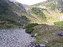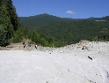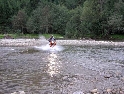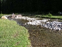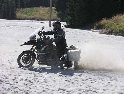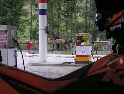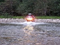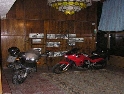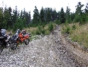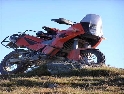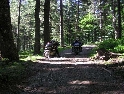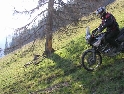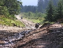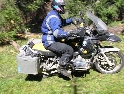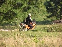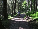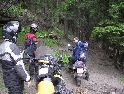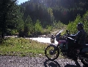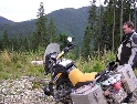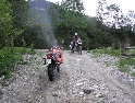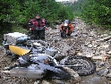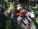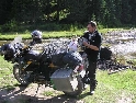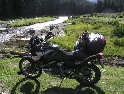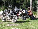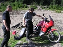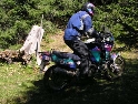 Den čtvrtý, pondělí 13.9.2004 První den v horách pod Michalovým vedením. Začínáme příjemnou šotolinou, ale najednou Michal jede kolmo na svah. To sice taky zkouším, ale za chvilku mne školí zadní kolo. Takže asi pojedu po cestě, že :-). Low píčuje, že jsme sračky a že on to dává s přehledem za Michalem. Hmmm. Pak máme krátkou pauzu kdy se řeší Lowowo proražené zadní kolo. Vlastně ho řeší Michal, kterej ví jak obsluhovat turatešácký záplaty. Jsme pod kopcem, který se ukázal býti třídícím. Africa Twin pod Michalem to dává. Já odpadám asi v půlce kopce, Low na začátku a Hajnej když viděl ty držky, tak na to prděl rovnou. Nějakým zázračným způsobem přesvědčuji offrouďáka Nr.1, že by to měl sjet na mé motce. Low to řeší také tak-:). Po pár stech metrech už neznáme cestu a tak přepínáme své offroad choutky do režimu průzkum. Několikrát se vracím, bo cesta je „asi“ nejetelná. Nakonec jedeme korytem, ve kterým se tahají klády. Místama je i metr a půl hluboké, teče tudy potok a kameny jsou tu snad všech velikostí. Píseček, oblázek, džudr, balvan, zasranej kus skály. V rámci celistvosti dojmů i zde několikrát pokládám motku. Nejhůře však, když mi padá ze stojanu, když pomáhám zvednout Hajnýmu afriku. Přicházím o zrcátko a páčka spojky má divnej tvar, ale drží. V samém závěru začíná popadávat Low. Přiznává, že má hlad a nemá sílu :-). Je to náročný to je fakt, ale je to i docela zábavný. Den ježdění nám končí brodem, který se chtěl skrýt v křoví, ale mé oko zkušeného hledače brodů ho vyhmátlo. Dávám ho několikrát v různých rychlostech. Pak i Hajnej. Fotíme a řádíme. Na světě je všeobecně málo brodů. K Vladimírovi přijíždíme mokrý, unavení a spokojený. Den nelze nezalít stádem piv.