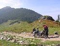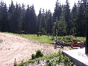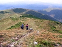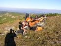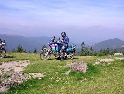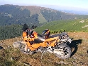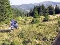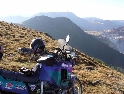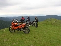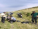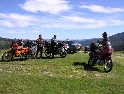 Den třetí, neděle 12.9.2004 Dnes je asi svátek a všichni jsou v krojích. Holky se na nás cudně usmívají a některé odvážnější i stydlivě mávnou. Vůbec nechápou co jejich sukýnkovité kroje a cudné postoje dělají s hormony středoevropanů vzhlídnuvších se v dobách mušketýrských, kdy na odhalený kotník psány byly básně a ukázané lýtko znamenalo divokou noc v náručí markytánky. A dost!!! V hotelu nevedli snídaně a tak celkem brzo slézáme z motek a téměř na vrcholku Prislopu obědváme. Nějaká rodinka tu piknikuje a připravuje maso na gril. Využívám jejich ohně – ochotně mi ho poskytli – a ohřívám si něco v konzervě. Hlavně, že to je vevnitř oranžové. Ze zkušenosti vím, že touhle barvou není co zkazit :-). Po obědě se vydáváme prozkoumat pár přilehlých cestiček. Je to paráda. Šotolinka, pohoda. Když sme zpátky na asfaltu tak měníme směr na offroad vložku. Při sjezdu házím držku a odtrhávám kufr z motorky. Nasazení zpět je jen otázka volby vhodného kamene a kombinace vzteku. U Vladimíra už na nás čeká Michal a Dorotka. Později přijíždí i Honza s Petrou a malým čertem J. Tentokrát je tu autem. Začal stonat Láďův transalp. Odešlo CDI. Jede za náma další asistenční služba a veze CDI z Ivanovy motorky. Večer nás zve Vladimír všechny na večeři. Ta je opravdu bohatá a asi i zdravá.