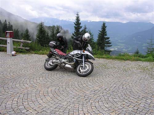 Den druhý, pátek 27.8.2004 Prší. Snídáme a padá déšť a taky rozhodnutí, že na GG dnes nejedeme. Jedeme do Halleinu velmi divnou štrekou. Tudy sem ještě nikdy nejel a i ti cyklisti vypadají vyděšeně. Přeci jen 10 motorek už je celkem slušnej had. Pak ale potkáváme traktor a už jsem si jist, že to není jen cyklotrasa. Chudák Cobra s passatem. Polovina lidí jde do solných dolů na prohlídku (já sice tentokrát nebyl, ale vřele doporučuji!!!). Druhá půlka se vydala pod vedením zkušeného znalce místních cest (mě :-)) na RossfeldStrasse za Halleinem. Tady se platí mýtné 3 Euro, ale zase to stojí za to. Zatáčka střídá zatáčku a i na mokru se dá celkem jet. Nahoře už se rozjasňuje a Německo je krásně jasné. Zato Rakousko má co dohánět. Mraky, mraky, mraky. Po setkání s dolařema, kteří jsou spokojeni, že svých 20 éček dobře zainvestovali, jedem na obídek, ale ukazuje se, že najít v Halleinu restauraci není až tak jednoduché. Povedlo se a plníme břicha (BULLe jednou se z těch stejků posereš). Po O jedem na Gaisberg. Neumím si představit návštěvu Salzburgu bez vyjetí na Gaisberg a okouknutí mích bývalých kolegů paraglajdystů. Je jich tam pár a lítají. Všichni okukují ten krásný výhled na Salzburg a já upadám do depky z nelétání. Nevím jestli sem chtěl sám sebe oklamat, ale v duchu sem si slíbil, že z toho pomyslného hřebíku to létání ještě někdy sundám!!! Odtud jedeme kolem staré přehrady a hlubokých kaňonů po horších cestách až do Gollingu kde na nás čeká Cobra (ztratil se, resp. zapomněl sem na něho :-( ) a stádo piv.