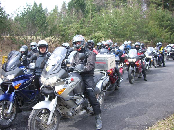 Sobota 15.4. Vstávám celkem v pohodě a jdu to ven omrknout. Ledový krunýř na motocyklech dává tušit že ranní teplota není nejvyšší :-(. Ani to však neodradí některé "oranžové" jezdce od ranní koupele v místním rybníce J. Po vydatné snídani začínají různá soutěžní klání jako turnaj ve stolním fotbale, střelba do nepřátel (vyfouknutá vajíčka s nápisy konkurenčních značek J), hod motorem (pro nedostatek motorů špalkem :-)), jízda pomalosti a požírání palačinek. Zejména ta poslední byla velice napínavá J. Po obědě nastává čas společného focení a poté již odjezd na vyjížďku. Díky mému jezdeckému umění jsem vyhrál výběrové řízení a mohl jsem celou vyjížďku vozit Zuzku součku :-). Naše cesta vede do dětského domova v Kamenici nad Lipou, kde jsou děti do 6-ti let. Jedeme sem předat finanční dar, na který jsme se před tím složili + nějaké drobnosti na zub malým špuntům. Bohužel přijíždíme příliš brzy a děti ještě spí. Domluvíme se tedy, že se stavíme za hodinu. Dělíme se na 2 skupiny, z nichž jedna čeká u kafe na místním náměstí a ta druhá jede najet nějaké kilometry po okolí. V 16 hod se opět setkáváme na zahradě dětského domova. Děti jsou naší návštěvou doslova nadšené a ty odvážnější se nechávají vysadit do sedla motorek a zkouší k čemu jsou všechny ty čudlíky :-). Předáváme naše dary a po chvíli vyrážíme opět na cestu. Máme namířeno na nedaleký kopec Křemešník, na jehož vrcholu se tyčí rozhledna Pípalka. Ti zdatnější z nás, zdolávají její vrchol - je odtud pěkný rozhled do okolí a taky tady pěkně studeně fouká. Po nezbytném focení míříme zpět na základnu do hotelu. Po večeři přichází vyhlášení vítězů soutěží a předání věcných cen. V jednotlivých kategoriích to dopadlo takto: