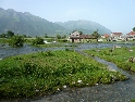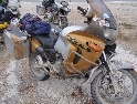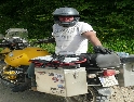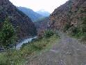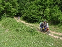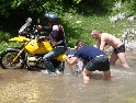 Nový slunečný den začínáme výbornou snídaní od paní domácí. Pobalíme věci a vydáváme se opět na cestu. Tato kapitola by se klidně mohla jmenovat "den kufrů". Šotolinovou cestu tvoří 2 vyjeté koleje a její okraje jsou posety kameny různých velikostí, které kolikrát nebezpečně vyčuhují. A tak Jirka s Davidem o ně postupně otvírají své hliníkové kufry jako konzervy. Má to jednu výhodu, alespoň má případná voda kudy odtékat :-). Ale není všem kufrům konec. Zrovna když ve stupačkách sjíždím mírný kopeček a přemítám nad tím jak je dobré mít kufry pěkně vysoko, že pak nic nehrozí, ozve se "lup" a najednou se válím v prachu na zemi vedle motorky, jejíž přední kolo kouká ze srázu k řece. Oklepu se, zkontroluji funkčnost všech končetin a posbírám oba utržené kufry (ale vcelku páč plast je plast :-) ). Je sice dobré mít kufry vysoko, ale je také třeba počítat s tím že jsou široké a je tedy možné jimi zachytit třeba o skálu.... Počkám na Ríšu s Křenym abysme společnými silami postavili motorku zpět na kola. Je v pořádku, takže jen přikurtuji utržené kufry zpět na své místo a je to.