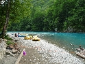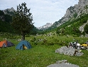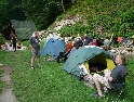 Navigace nás neomylně vede hustými lesy a po sérii serpentin s ostrými vracečkami sjíždíme až do údolí, k řece Tara. V kempu je, na jediném rovném plácku široko daleko, naskládáno několik desítek chatiček a jedna větší občerstvovací chata. Kemp je totálně narvaný srbskými raftaři. Po krátké domluvě se šéfem kempu se však pro naše 3 stany nějaké místo přece jenom najde. Postavení stanů je otázkou chvilky. Následuje nezbytná konzumace piva a domácí slivovice a pouštím se do vaření večeře.
