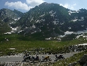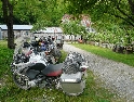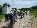 Ranní sluneční paprsky nás nekompromisně tahají ven ze stanu. Koukám, že všichni kluci mají naše "teamová" trička naruby. Prý byli večer posedět u ohně a albánská orlice na jejich hrudích příliš dráždila srbské osazenstvo kempu. Ze stanu vylézá i náš "ožrala" a jakmile ho spatří místní srbové, hned se s ním fotí a zdraví jako staří kamarádi a vůbec nechápou, že stojí na vlastních nohách. No, večer to muselo být pěkně vostrý :-). Podle mojeho předpokladu se ranní odjezd mění na lehce předpolední. S několika lehkými pády vyjíždíme nahoru šotolinové serpentiny a vracíme se na hlavní cestu. Opouštíme BiH a po několika šotolinových kilometrech přijíždíme k hranici jak ze Tří veteránů - vítejte v Černé Hoře.