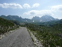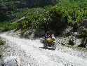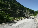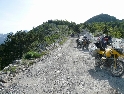 Za slunečného dopoledne stojíme na albánské hranici a vyřizujeme běžné formality. Kousek za celnicí končí asfalt a začíná šotolina. Vítejte v Albánii. Je hic, sucho a hodně se práší. I když máme mezi sebou celkem velké rozestupy, vypadáme za chvíli jak pracovníci vápenky :-). Cestou řešíme první defekt - na zadním kole Ríšova varadera. Guma je nešťastně „říznutá“. Zalepujeme to nouzově sprejem a jedeme dál. Cesta vede nádherným údolím a končí ve vesnici Hani i Hotit, kde se napojuje na asfaltovou hlavní silnici na Shkoder. Odbočujeme na jih a zastavujeme v městečku Koplik. Zde doplňujeme zásoby a odlehčujeme trezorům místních bank :-). V jakékoliv vesnici nebo městě v Albániii vás na první pohled zaujme neuvěřitelný bordel a hromady odpadků povalující se všude možně. Postáváme před bankou a Míla se rozhlíží, kde je nějaký koš, kam by vyhodil prázdnou PETku. Všimne si ho pikolík z banky a ochotně se jí ujímá. Udělá pár kroků a láhev končí za torzem keřů živého plotu. Inu, jiný kraj...