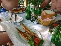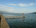 Za poledního žáru se vydáváme na cestu i my. Před městem Librazhd končí šotolina a kvalitní asalt nás provází až k Ohridskému jezeru, které je našim dnešním cílem. Na malém poloostrově před makedonskými hranicemi hledáme vhodné místo pro přenocování. Kromě luxusního hotelu tu ovšem nic není. Avšak jen na první pohled. Cestou zpět si všimneme restaurace na břehu jezera s dřevěnými altánky pod kterými jsou jídelní stoly. Stavíme. Menu je jasné, všichni si dáváme korana - místní pstruh, který je na makedonské straně chráněn, zde je však vítanou pochoutkou. Jsme tu jediní hosté a pan domácí ještě netuší, že jsme se tu dnes rozhodli přenocovat :-). Luxusní koupačka, v jezeře, výborná večeře a piva řádně plní náš účet. Přidává se k nám i pan domácí jehož hostíme naší slivovicí. Načež pronese větu na kterou jsme čekali: tak tu přespěte :-). Plážová lehátka se stěhují