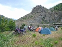 Stav pláže nepřekvapuje - povrch je lehce bordeloidní. Pravda, na skládce jsem se ještě nekoupal, ale nijak zvlášť po tom nikdo z nás netouží a tak dovádění ve vlnách a slunění se na písečné pláži bere za své. Chvíli tu zevlujeme a jedeme zpět. Ve Fieru se napojujeme na původní trasu a přes Lushnje a Rrogozhine jedeme směrem na Elbasan. ještě před městem odbočujeme doprava a po úzkých silničkách jedeme na Gramsh. Cesta vede po dně prázdné přehrady a za městečkem Gramsh se mění v šotolinovou, která nás provádí celým kaňonem. Slunce již pomalu zapadá a nám se naskýtají krásné pohledy na zajímavě osvícenou krajinu. Je na čase poohlídnout se po nějakém spaní. Což ovšem není jen tak. Napravo sráz k řece, nalevo skály. Asi až v polovině kaňonu je po pravé straně malý travnatý plácek, vhodný akorát na naše stany. Dokonce se tu najde i hromada klestí na oheň.